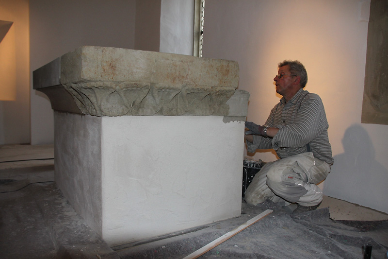 Der Königsberger Steinrestaurator Petro Schiller hatte den Auftrag übernommen, das gesamte gelagerte Steinmaterial in den Räumlichkeiten der ehemaligen Kapelle aufzulisten und zu bewerten. Dabei fand er drei Steinfragmente mit einem gotischen Wolkenband. Er erkannte, dass diese Einzelteile zueinander passten und verdübelte sie miteinader. Als Originalteile des ehemaligen Altars, so seine Erkenntnis, fügen sie sich dem Altartorso an. Der noch fehlende Teil der Altarplatte, auch Mensa genannt, wurde mit einem Neuteil aus Sander Sandstein ergänzt. Mit dem Scharriereisen, einem Steinmetzwerkzeug, wurde die steinsichtige Oberfläche des neuen Teilstückes in Handarbeit den Originalfragmenten angeglichen.