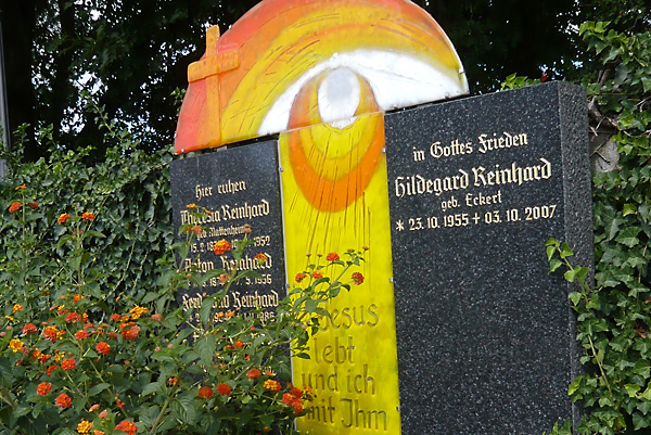 Haßfurt. So zeigt sich persönlicher Glaube an die Auferstehung: Christus als strahlende Sonne, das Kreuzsymbol durchbricht das Sonnenrad und verweist auf die uns geschenkte Versöhnung mit Gott. Leuchtend Gelb- und Rottöne in Glas gegossen verkünden hoffnungsfroh die Erlösungsbotschaft an die Christen. „Jesus lebt und ich mit ihm“ hat Bernd Reinhard, der Ehemann seiner im Jahre 2007 verstorbenen Ehefrau Hildegard, als Frohbotschaft in das neugestaltete Familiengrabmal im Alten Friedhof an der Ritterkapelle eingravieren lassen. Die Kunstglaswerkstatt Oskar Weinfurtner aus Arnbruck im Bayerischen Wald hat in Abstimmung mit Reinhard – er hatte sich an zahlreichen Grabstätten informiert - diese Glasarbeit mit ihrem besonderen Charakter kreativ und einmalig gestaltet. Die Glasflächen, auch im Mittelteil der Anlage, werden jeweils von Metallschienen gehalten. Geglückt in der Gestaltung die Verbindung von tradtitionellem Grabmal und neuem Gedankengut.