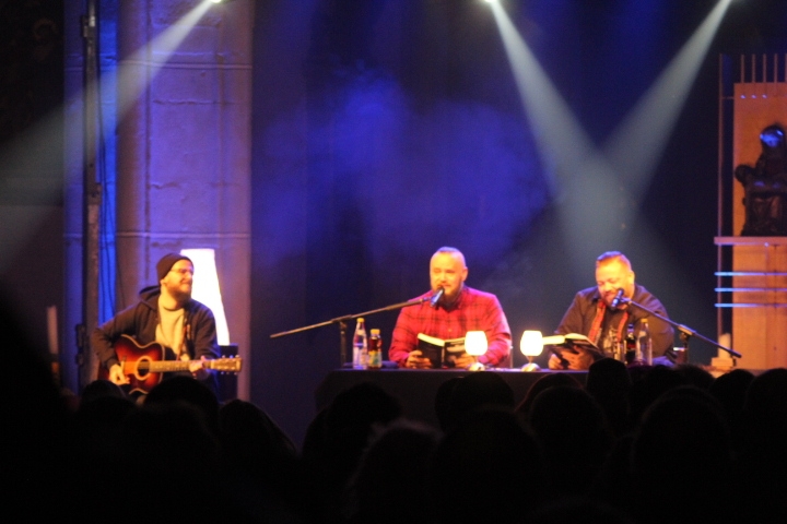 Haßfurt. Zwei bis oben hin tätowierte, anscheinend harte Jungs der Deutschrock-Szene in einer Kirche… geht das? Ja, es geht und sogar sehr gut. Dies zeigte ein beeindruckender Abend mit Sven Gillert und Hagen Stoll, ehemalige Rapper, jetzt Frontmännern der Band „Haudegen“, in der Ritterkapelle in Haßfurt. Beide sind in Marzahn, einer Ostberliner Plattenbausiedlung großgeworden und gründeten 2010 die Band Haudegen, die Rockmusik in bester Liedermacher-Tradition spielt. Ihr letztes Album „Lichtblick“ stieg bis auf Platz 2 der deutschen Charts. Gillert und Stoll lasen in der Ritterkapelle ausgewählte Kapitel aus ihrem neuen Buch „Zusammen sind wir weniger allein“ und sangen dazu passende Lieder, nur von einem Gitarristen begleitet. Der Konzertabend wurde ausgerichtet und organisiert vom Verein rock hassfurt e.V. In ihren sehr persönlichen Erzählungen kamen die Musiker auf ihre harte Jugend in Marzahn, in der es galt sich durchzusetzen und auf ihre Großväter, buchstäblich Haudegen, die ihnen das Leben lehrten. Sie handelten auch von den „Opfern“ des Musikerlebens und Merkwürdigkeiten in der Musikbranche. Schließlich gaben sie aber mit dem Abschlusskapitel ihres Buches den etwa 200 Besuchern des Konzertes auch eine Botschaft mit auf den Weg: „Wir befinden uns in einem Umbruch. Wir öffnen unsere Tore für Flüchtlinge, und wir haben allen Grund, sie freundlich aufzunehmen.“ In ihrem Buch raten sie deshalb: „Komme mit Respekt und gehe mit Respekt. Unterschätze keinen, verachte keinen, missachte keinen.“ Eine Botschaft, die in einer Kirche mit dem Blick auf das Kreuz Jesu mit Sicherheit einen guten Platz hat.
