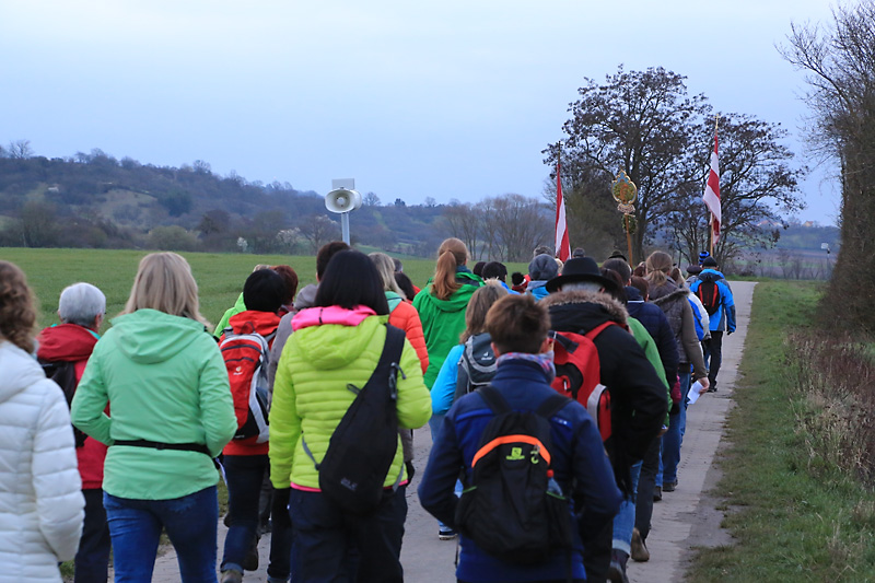 Ausgehend von der Symbolik der Farbe Grün und der Buntheit der Natur wurde die Hoffnung auf die Auferstehung und das Leben nach dem Tod meditativ erschlossen. Zwischen den Gedanken folgten immer wieder österliche Lieder. bis man schließlich in Augsfeld in die Kirche einzog. Nach einer kurzen Andacht ging es weiter über den Flurbereinigungsweg nach Haßfurt in die Pfarrkirche. Mit dem Segen und einem Marienlied schloss die Wallfahrt. Im Pfarrsaal starteten die Gläubigen mit einem gemeinsamen Frühstück in den Tag.