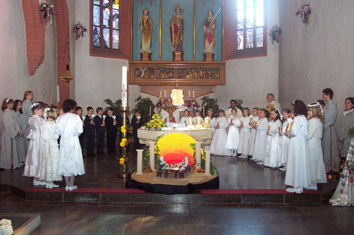 Haßfurt. Am Sonntag, 15. April feierten 31 Jungen und Mädchen ihre erste Hl. Kommunion. Thema des Gottesdienstes war das Emmaus-Evangelium. Mit dem Stadtpfarrer P. Reinhold Schmitt zelebrierten P. Austin und Generalvikar Dr. Hillenbrand.