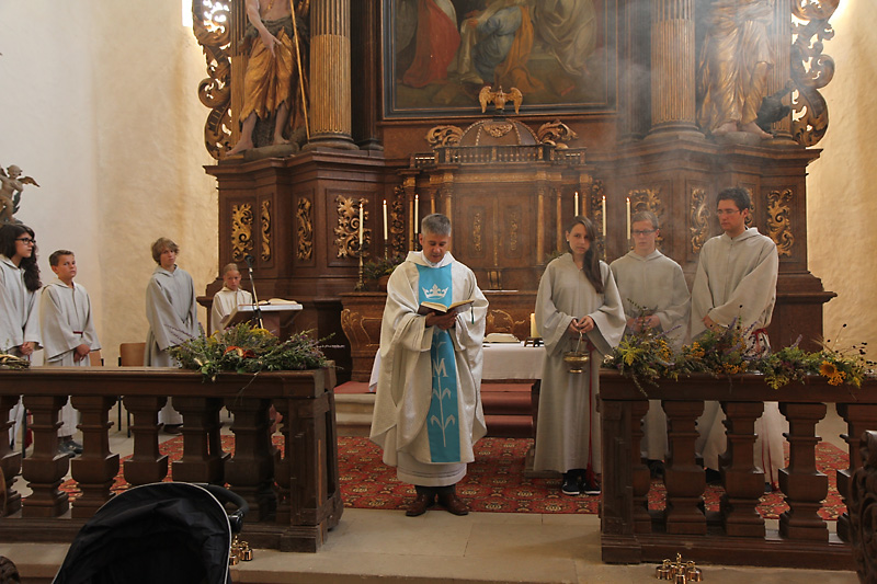 Mariaburghausen. Das Hochfest Mariä Aufnahme in den Himmel feierte die kath. Gemeinde Haßfurt wie jedes Jahr in der Klosterkirche Mariaburghausen. Mehrere hundert Gläubige waren gekommen, die den Kirchenraum bis weit in die Säulenhalle hinein füllten.