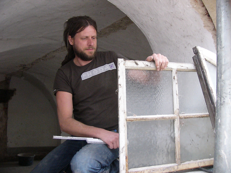 Handwerker bei der Instandsetzung des Beinhauses mit St. Michaelskapelle
