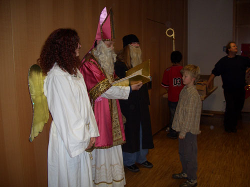 Haßfurt. Am Freitag, 8. Dezember 2006, veranstalteten die Minis ihre Weihnachtsfeier. Die etwa 40 Kinder und Jugendlichen durften zunächst bei einer Ralley durch die Stadt Quizfragen beantworten, Weihnachtslieder vorsingen auf dem oberen Turm basteln uvm. Im Anschluss daran kamen die Gruppen wieder im Pfarrsaal zusammen und der besinnlichere Teil begann bei Kinderpunsch und Plätzchen. Gegen 20 Uhr traf dann der Nikolaus mit seinen Helfern ein, der über jeden einzelnen Ministrant zu erzählen hatte. Als Weihnachtsgeschenk erhielten die Minis blaue Tassen mit dem Ministrantenmotiv.