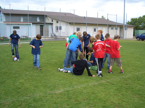 Im Anschluss ging die Schar in die Turnhalle, dort lernte man sich mit Spielen besser kennen. Beispielsweise mussten sich die Kinder und Jugendlichen im Alphabet des Vornamens aufreihen und viel Spaß hatten die Minis beim Menschen-Bingo. Auch bei der Erzählung einer Geschichte waren die Kids aktiv gefordert: Es kamen immer wieder Wörter wie z.B. Feuer, Wind und Wasser vor, bei denen die Teilnehmergruppen jeweils die Bewegungen nachmachen sollten. Das Mittagessen und die Bewirtung hatte freundlicherweise der FC Augsfeld übernommen, es gab reichlich Bratwürste, Laugenstangen und Getränke.