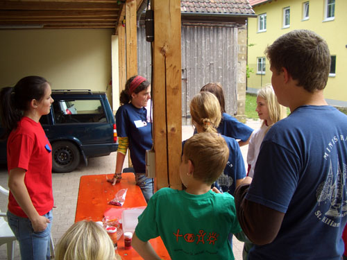 Durch den Tag zog sich das Thema Freundschaft. Die Minis erhielten ein Lederband, das sich im Laufe des folgenden Geländespiels mit Perlen auffüllen sollte. An jeder Station kam eine farbige Perle für die erfolgreiche Teilnahme hinzu. Die sieben Stationen waren im ganzen Dorf verteilt und wurden von Leitern aus den unterschiedlichen Pfarreien übernommen. In der Kirche quizzten die Minis beim Kaplan, am Pfarrhaus mussten sich die Kids einem Geschmackstest unterziehen, am Spielplatz war ein Hindernisparcours zu meistern, neben dem Sportheim mussten die Kids Sackhüpfen und mit viel Geschick Slalom-Schubkarrenfahren, wobei auf der Ladefläche zwei Becher mit Wasser standen, im Lindenhain ein Ballspiel und auf dem Sportplatz war Balance und Zielgenauigkeit gefragt: Nachdem man sich zehn Mal um die eigene Achse gedreht hat, galt es auf das Tor zu schießen und den Elfmeter zu versenken.