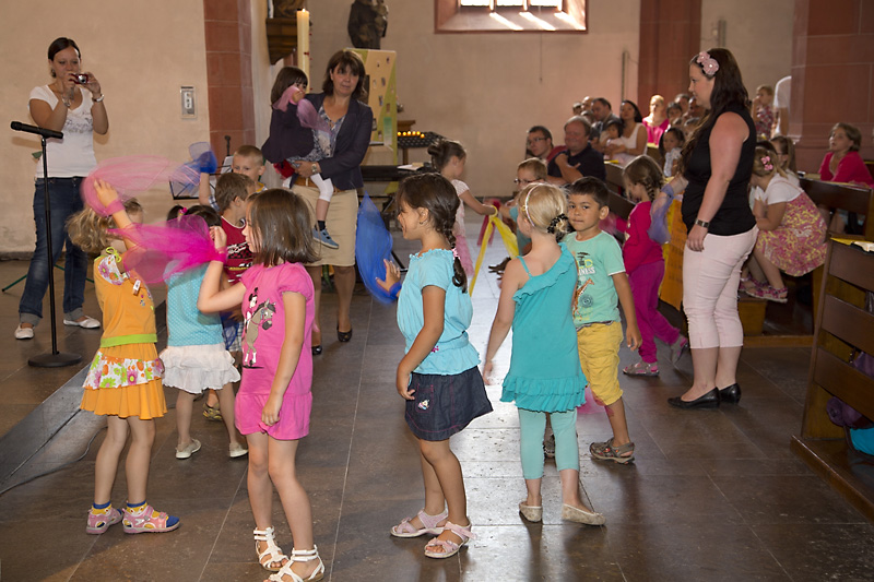 Der Familiengottesdienst wurde vom Kinderchor unter Leitung von Kirchenmusiker Johannes Eirich feierlich mitgestaltet. Die Kinder bauten ein Kirchenhaus aus lebendigen Steinen: Symbolisch stellte jedes Bauteil eine Person oder Gruppe in der Pfarrei dar. In der Predigt ging Pfarrer Eschenbacher darauf ein, dass Kirche und Gemeinde umso bunter und vielfältiger wird, je mehr sich in das Pfarreileben einbinden lassen. Es sei wichtig, Räume zu schaffen, wo Menschen sich spirituell beheimaten könnten und gelingende Gemeinschaft erfahren könnten untereinander und mit Gott. Dies sei heute um so wichtiger, weil immer mehr Menschen Kirche fremd geworden ist. Nach dem Gottesdienst lud Pfarrer Eschenbacher alle zum Pfarrfest ein.