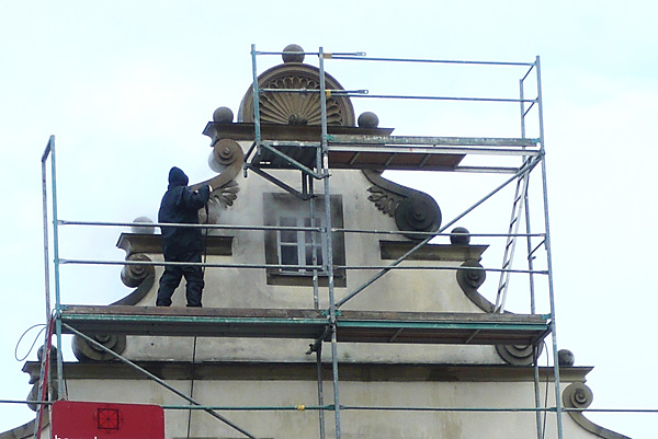 Imponierend und gefällig die beherrschenden Bauelemente des südlichen Treppengiebels: Kugel und Volute (schneckenförmige Verzierung) als dekorativer Schmuck. Bekrönt ist die fast symmetrische Fassade - mit Ausnahme der Fensteränderung – mit einer halbkreisförmigen Fächerrosette und mit floraler Gestaltung. Diese Schauseite ist waagrecht durch drei Gesimse aufgegliedert. Die Fenstergewände im mittleren Geschoss zeigen rechts, links und in der Mitte wiederum Voluten als Ornamente, während die Gewände der Fenster im Erdgeschoss „geohrt“ sind, eine Ohrmuschel tragen. Das Traufgesims selbst schließt mit einem Schmuckelement in S-förmiger Profilform als Bauglied ab.