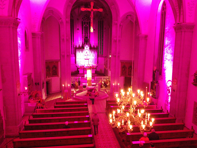 Durch eine besondere Beleuchtung, die uns freundlicherweise die Stadt zur Verfügung gestellt hatte, war die Ritterkapelle im Innern in rötliches Licht getaucht. Zusätzlich sorgten viele brennende Kerzen für eine wohltuende Atmosphäre. Es lief meditative Musik und es lagen Texte an bestimmten Orten in der Kirche aus, die inhaltlich an diese Stelle passten. Die Besucher waren eingeladen, zur Ruhe zu kommen, sich von der beruhigenden Stimmung anstecken zu lassen, sich mit den Texten selbst zu beschäftigen, oder im Sitzen einfach seinen Gedanken und Gebeten nachzugehen. Dieses Angebot sollte ein bewusster Kontrapunkt zum Rummel am Straßenfest sein. Dankbar wurde "die Ritterkapelle in einem anderen Licht" von vielen wahrgenommen. Das positive Echo ermuntert uns, im nächsten Jahr wieder zum Straßenfest die Ritterkapelle zu öffnen.