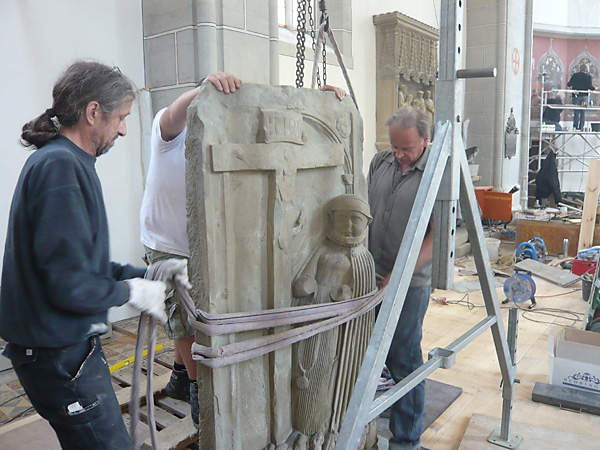 Mit Hilfe eines Portalkrans und eines Flaschenzugs bewegt der Königsberger Bildhauer gemeinsam mit seinen Mitarbeitern die gewichtigen Monumente gezielt an die Außenwände des Kapelleninnenraumes auf einen vorbereiteten Sockel. Auf diese Weise wurden bereits zwei weitere historisch bedeutsame Epitaphe montiert. Sie waren vorübergehend ausgelagert.