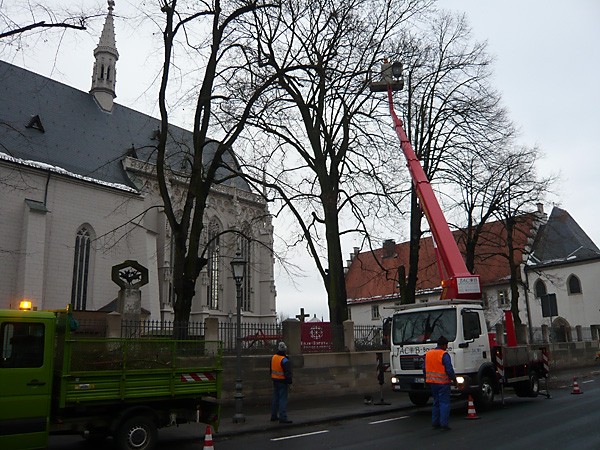 Haßfurt. Von einer Arbeitsbühne aus auf einem LKW-Hubsteiger, mit einer Motor- oder Astsäge in der Hand, entfernt ein Mitarbeiter der Firma Jacob aus Fladungen Totholz oder Überhangholz vom Baumbestand an der Ritterkapelle. Gleichzeitig werden die Baumkronen ausgelichtet und gepflegt. Städtische Angestellte arbeiten das Schnittholz umgehend auf. Doch das Grundproblem des gealterten Baumbestandes bleibt bestehen: Das in die Jahre gekommene Weichholz der Linden bricht sehr leicht. Das bedeutet eine Gefahr für die Verkehrsteilnehmer und eine mögliche Schadensursache für die inzwischen restaurierte Einfriedungsmauer mit ihren Zaunfeldern. Wohl Anlass für die Verantwortlichen in Stadt und Landratsamt, sich eingehend und vorausschauend mit der Außenanlage der Kirche zu befassen, zumal ja auch die Denkmäler für die Gefallenen der Kriege, die grunderneuerte Fassade des Gotteshauses und ihr Anblick mitbedacht werden müssen.