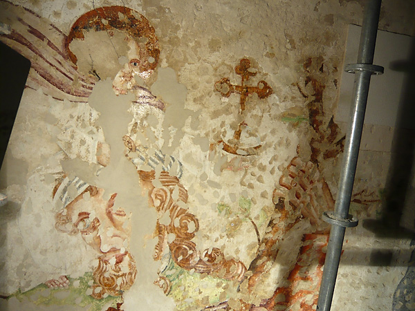 Wie das Detailbild erkennen lässt, haben die Restauratoren bereits grundlegende subtile Arbeit geleistet: eine dickwandige Putzschicht wurde vorsichtig abgenommen, der hohlliegende durchgehende Riss im Gemälde mit Spezial-Fugenmörtel hinterfüllt und geschlossen. Unter Fürstbischof Rudolf von Scherenberg (1466 – 1495) war diese Südwand unter der Last des Dachstuhls und der Stein-Gesimse nach außen gekippt. Dick aufgetragener Innenputz glich die Abweichung aus. Damit dieser Putz Halt fand, wurden „Hacklöcher“ in die Wand und damit in das Gemälde geschlagen. Die Hackspuren sind inzwischen bündig gekittet und geschlossen. Befunde weisen darauf hin, dass interessanterweise auch Gold bei der Fassung des Heiligen noch zu finden ist, so im Heilgenschein des Jesukindes, im Kreuz der Weltkugel, auf der Schließe des Umhangs und auf den Knöpfen seines Gürtels und seiner Reisetasche – Symbol des Göttlichen und Ewigen. Zu Empore hin sind noch Teile der Heilgengestalt zu untersuchen und freizulegen. Dann geht die Darstellung in die Rollwerkmalerei – fragmenthaft freigelegt - am Maßwerkfenster über. In einem weiteren Arbeitsschritt retuschieren die Kirchenmaler die Fehlstellen mit einem neutralen Farbton. Schon jetzt können sich aber die Haßfurter Bürger auf ein außergewöhnliches Wandgemälde in ihrem Wahrzeichen Ritterkapelle freuen, wenn im kommenden Jahr alle Restaurierungsarbeiten beendet sind.