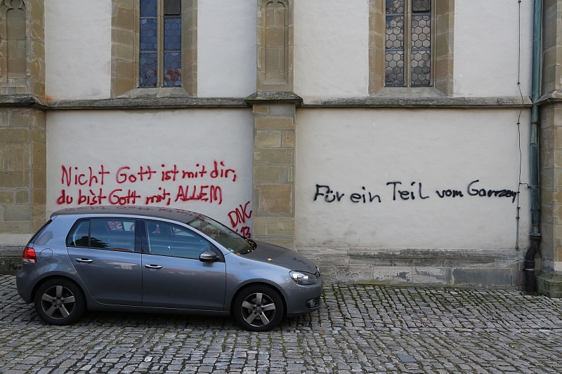 Haßfurt. Die Nordfassade der Pfarrkirche Haßfurt wurde in der Nacht von Mittwoch, 19. Oktober auf Donnerstag, 20. Oktober Ziel einer Sachbeschädigung. Mit Sprühfarbe in rot und schwarz wurden zwei Wandabschnitte beschmiert. Offensichtlich wollte der Täter mit dem Text Religionskritik üben: "Nicht Gott ist mir dir, du bist Gott mit allem. Schreibe deine Zukunft." Dies war der zweite Vorfall nach Schmierereien an der Ritterkapelle vor etwa 2 Jahren.