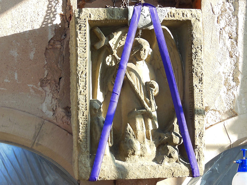 Steinrestaurator Petro Schiller aus Königsberg erweckte es wieder zum Leben. So wurde das Sandsteintrelief in diesen Tagen in eine Aussparung der Südfassade des Beinhauses von ihm eingesetzt. Schiller hatte nach Rücksprache mit dem Landesamt für Denkmalpflege den Auftrag übernommen, das historische Bildwerk zu konservieren und den vorgefundenen Bestand zu sichern.