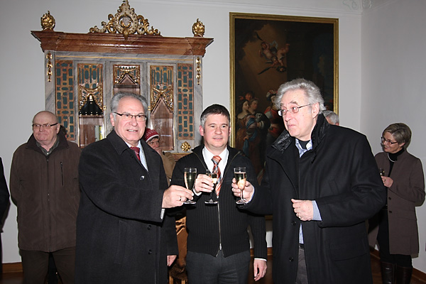 Haßfurt. Bürgermeister Rudi Eck, Stadtpfarrer Stephan Eschenbacher und Architekt Dag Schröder (von links) stoßen mit einem Gläschen Sekt auf die gelungene und abgeschlossene Renovierung des Pfarrhauses an. Ein Segensgebet durch den neuen Hausherrn, der in den nächsten Tagen hier einziehen wird, sowie Gruß- und Dankworte an die beteiligten Firmen und ehrenamtlichen Helfer beschlossen den offiziellen Teil. Den passenden Rahmen dazu bot das Prachtzimmer, der Kapitelsaal, im Erdgeschoss mit seiner einmaligen Bandstuck-Decke von 1735. Zahlreiche Gäste fanden sich im Laufe des Sonntagnachmittatgs zu einem Kurzbesuch ein. Anschließend besuchten sie im Pfarrheim den Adventsbasar und konnten dabei noch Kaffee und Kuchen genießen.