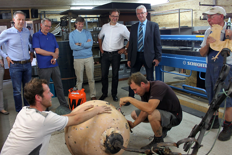 Dachdeckermeister Johannes Schobert hatte den Auftrag übernommen, den Schaden zu beheben. In seiner Werkstatt am Moosanger arbeitet er gerade eine ca. zwei Meter lange Naht der beiden Kugelhälften mit dem Lötkolben auf. Üblicherweise sind in einer Tumkugel Zeitdokumente sicher verwahrt. Sie werden jeweils bei notwendigen Turmrenovierungsarbeiten aktuell ergänzt. Meister Schobert wird bei seiner stundenlangen Arbeit von seinem Mitarbeiter (links) Oli Holzheimer und (rechts) von seinem Vater Anton untersützt. Interessiert und erwartungsvoll beoachten die Vertreter von Landratsamt, Kirchenverwaltung und Stadt mit Bürgermeister Günther Werner das umsichtige Vorgehen. Dann zeigten sich in einem kupfernen Zylinder unbeschadet Schriftstücke und Geldscheine. Über den Inhalt der Dokumente wird demnächst noch von Stadtarchivar Thomas Schindler berichtet.
