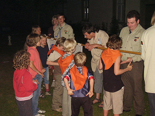 Am Samstagmorgen trafen sich die neuen Wölflinge mit ihren Gruppenleitern um zuerst einmal das Schwimmbad in Gerolzhofen unsicher zu machen. Wieder zurück im Pfarrzentrum wurde in einem Workshop der Halstuchknoten erstellt und anschließend das Abendessen gekocht. Am anschließenden Lagerfeuer wurden Lieder gesungen und Stockbrot gebacken um die Wartezeit auf den Vorstand zu überbrücken. Um kurz nach 23:00 Uhr war es dann soweit. Nach einer kurzen Einführung durch die Stammesvorsitzenden legten zuerst die beiden neuen Leiter, Johannes Brunnquell und Alexander Gehrke ihr Leiterversprechen ab. Dann kamen die Wölflinge an die Reihe. Sie versprachen "Zu dieser Gruppe will ich gehören, da will ich mitmachen. Die Regeln, die sich die Gruppe gibt, will ich befolgen und mein Verhalten danach ausrichten." Nach der übergabe des orangenen Halstuches und dem mit der linken Hand ausgeführten Pfadfindergruß wurde am Lagerfeuer das Pfadfinderlied gesungen und der ereignisreiche Tag klang am Lagerfeuer aus. Nach einer kurzen Nacht musste am Sonntagmorgen nach dem Frühstücken noch das Pfarrzentrum aufgeräumt werden bevor man sich mit einem Abschlusskreis bis zur nächsten Gruppenstunde verabschiedete.