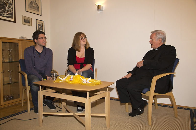 Das Team interviewte Herbert Baumann in seiner Wohnung und fragte nach den Aufgaben des Regens, dem Ausbildungsleiters des Seminars. Neben der Auswahl der Bewerber und der Begleitung der Seminaristen übernimmt er Verwaltungsaufgaben für die Gebäude und das Personal. Gegen 11 Uhr traf schließlich der Bischof nach einer Begegnung mit den Pfadfindern der Diözese zum Georgstag im Seminar ein. Er hatte sich extra Zeit genommen und stand dem Haßfurter Videoteam Rede und Antwort zu allen Fragen rund um den Priesterberuf und die Ausbildung. Auf die Frage, was ihn in seinem Leben als Priester trägt, antwortete er, er habe in seiner Jugend „Christus als eine Wirklichkeit kennengelernt, als Person, die man ansprechen kann, der auch Antwort gibt“. Aus der Motivation heraus, dies anderen weiterzugeben, entschied er sich für den Weg zum Priestertum.